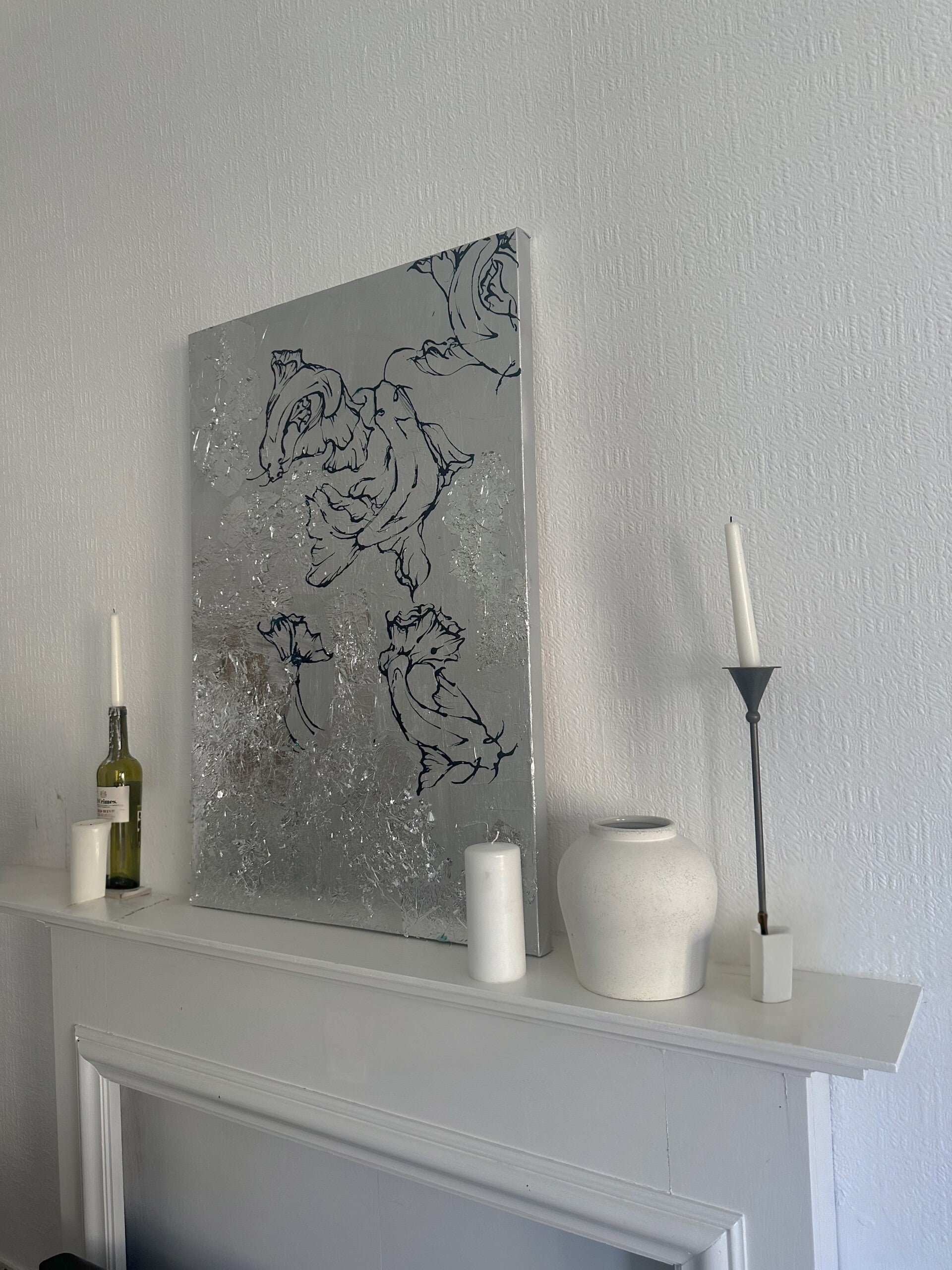 Silver foil, spraypaint, indian calligraphy ink on canvas. 60x80 estimated size.